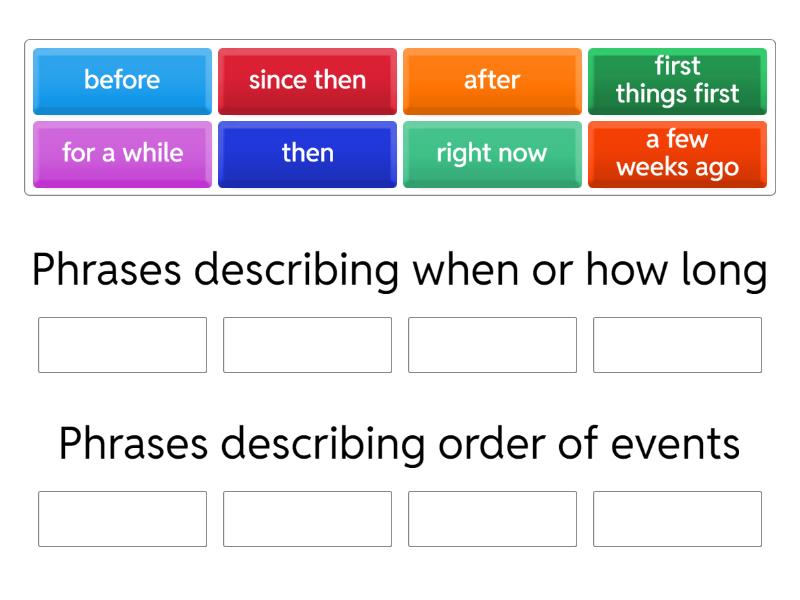 Phrases describing when or how long: a few weeks ago, for a while , right now, since then, Phrases describing order of events: after , before , first things first, then,