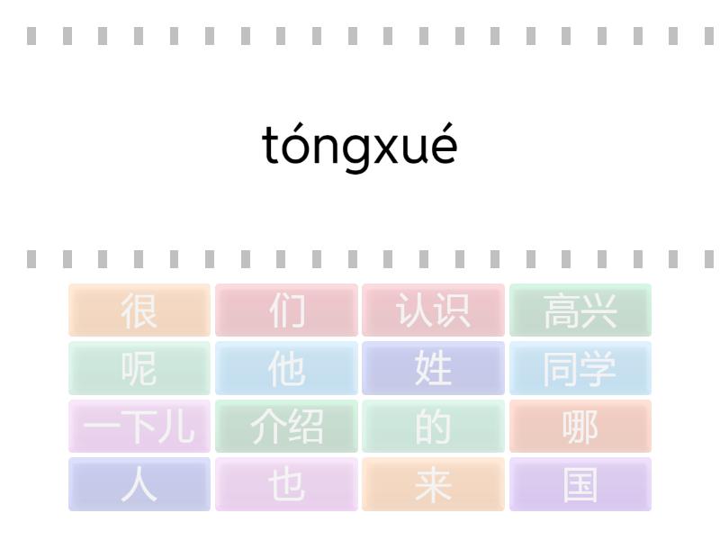 同学 - tóngxué, 们 - men, 来 - lái, 介绍 - jièshào, 一下儿 - yīxiàr, 姓 - xìng, 的 - de, 哪 - nǎ, 国 - guó, 他 - tā, 认识 - rènshi, 很 - hěn, 高兴 - gāoxìng, 也 - yě, 人 - rén, 呢 - ne,