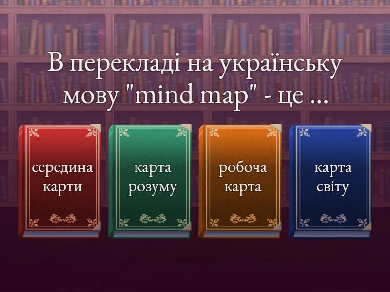 1) В перекладі на українську мову "mind map" - це ... a) середина карти b) карта розуму c) робоча карта d) карта світу 2) Ментальна карта виглядає як ... a) кругова діаграма b) графік c) мережа нейронних зв'язків мозку d) географічна карта 3) Синонім до словосполучення "ментальна карта" a) зручна карта b) карта доріг c) інтелект - карта d) чорна карта