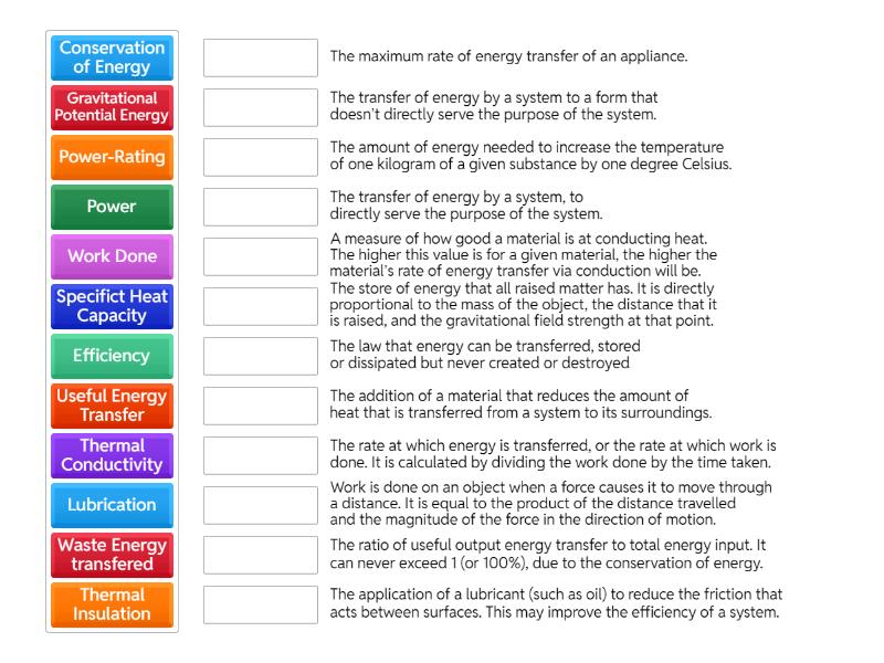 Conservation of Energy - The law that energy can be transferred, stored or dissipated but never created or destroyed, Efficiency - The ratio of useful output energy transfer to total energy input. It can never exceed 1 (or 100%), due to the conservation of energy., Gravitational Potential Energy - The store of energy that all raised matter has. It is directly proportional to the mass of the object, the distance that it is raised, and the gravitational field strength at that point., Lubrication - The application of a lubricant (such as oil) to reduce the friction that acts between surfaces. This may improve the efficiency of a system., Power-Rating - The maximum rate of energy transfer of an appliance., Power - The rate at which energy is transferred, or the rate at which work is done. It is calculated by dividing the work done by the time taken., Specifict Heat Capacity - The amount of energy needed to increase the temperature of one kilogram of a given substance by one degree Celsius., Thermal Conductivity - A measure of how good a material is at conducting heat. The higher this value is for a given material, the higher the material’s rate of energy transfer via conduction will be., Thermal Insulation - The addition of a material that reduces the amount of heat that is transferred from a system to its surroundings., Useful Energy Transfer - The transfer of energy by a system, to directly serve the purpose of the system., Waste Energy transfered - The transfer of energy by a system to a form that doesn’t directly serve the purpose of the system., Work Done - Work is done on an object when a force causes it to move through a distance. It is equal to the product of the distance travelled and the magnitude of the force in the direction of motion.,