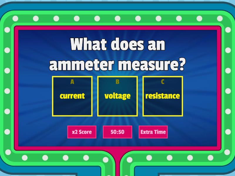 1) What does an ammeter measure? a) current b) voltage c) resistance 2) How is an ammeter connected in a cicuit? a) In parallel b) In series c) Accross the cell 3) A propety of matter that can be positive or negative a) Desnity b) Charge c) Volume d) velocity 4) The unit of charge a) Amps b) Volts c) Colombs 5) Component that only allows current to flow in one direction. It has a very high resistance in the reverse direction. a) Diode b) Filament bulb c) Wire 6) Current from batteries and cells: a) consists of charge flowing in multiple directions b) Consists of charge flowing in a single direction 7) The removal of excess charge by providing a low resistance path for current to flow is known as... a) Neutralising b) Uncharging c) Earthing 8) Current is the rate of flow of electrical charge. In metals how does this current flow? a) As moving electrons in an open loop b) As ossilating ions c) As moving electrons in a closed loop 9) What direction do electric field lines point? a) In the direction in which a negative charge would experience an electric force b) Point in the direction in which a positive charge will experience an electric force. c) Point in random directions 10) A region in which a charge will experience an electrostatic, non-contact force... a) Electric field b) Magnetic field c) Gravitational field 11) A light emmitting component consisting of an enclosed metal filament... a) LDR b) Filament Lamp 12) What happens to the resistance of an LDR as light intensity increase? a) Increases b) Stays the same c) Decreases 13) What minimum voltage must be applied accross a LED before it illuminates? a) 0.4 V b) 0.6 V c) 0.7 V 14) What causes a lightning strike? a) A discharge of charge b) Build up of static charge (without discharging) 15) An ohmic conductor = A conductor whose current flow is directly proportional to the potential difference accross it when what is constant? a) Current b) Voltage c) Light intensity d) Temperature 16) Unit of resistance... a) Volts b) mm c) Coulombs d) ohms 17) In parallel plates the electric field between the two charged plates is... a) alternating b) uniform c) random 18) What happens to an electric field around a point charge as you move further away? a) Weaknes b) Strengthens 19) The energy transferd per unit of charge between two points in an electric circuit is known as... a) Potential difference not voltage b) Potential difference or voltage c) Voltage not potential difference 20) Power = the rate at which an appliance transfers energy. How is it calculated? a) P=Resistance / I squared b) P=I squared / R c) P = IV d) P= Et 21) Describe the total resistance in a parallel circuit: a) sum of all the individual resistors b) resistance of the largest resistor c) resistance of the smallest resistor d) less than the lowest individual resistance 22) Describe the total resistance in a parallel circuit: a) sum of all the individual resistors b) resistance of the largest resistor c) resistance of the smallest resistor d) less than the lowest individual resistance 23) In a series cicuit the components... a) have different currents passing through b) have the same current passing through 24) In a series circuit the pd of the power supply... a) Is the same accross all components b) Is shared accross components 25) Sparking occurs between 2 components that have an imbalance of.. a) current b) voltage c) charges 26) Static charge is caused by... a) an imbalance of positive and negative charges b) an imbalance of positive and neutral charges 27) <img src="https://upload.wikimedia.org/wikipedia/commons/thumb/1/10/Thermistor.svg/2560px-Thermistor.svg.png" alt="File:Thermistor.svg - Wikipedia"/> Name this component + what does its resistance depend on? a) Thermister - Light intensity b) LDR - Light intensity c) Thermister - Temperature d) LDR - temperature 28) What is one volt equilvalent to? a) one coulomb per joule b) one joule per coulomb c) one amp d) one coulomb 29) Why is a voltmeter connected in parallel to a component? a) To measure pd acrross the component b) To measure pd through the component 30) What is the unit of power? a) V b) A c) Ʊ d) W