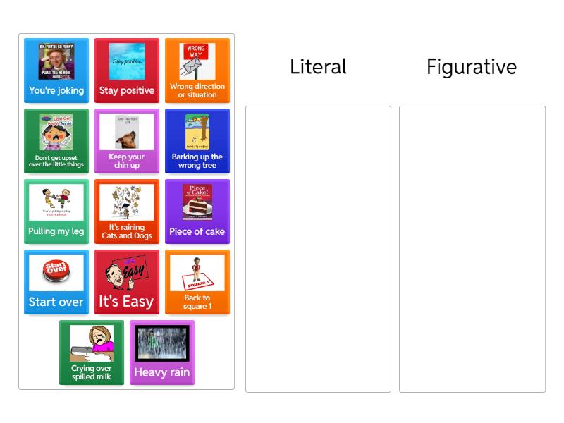 Literal: It's raining Cats and Dogs, Piece of cake, Crying over spilled milk, Pulling my leg, Barking up the wrong tree, Keep your chin up, Back to square 1, Figurative: Heavy rain, It's Easy, Don't get upset over the little things, You're joking, Wrong direction or situation, Stay positive, Start over,
