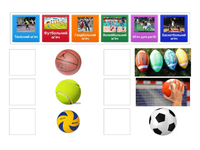 Футбольний м'яч , Волейбольний м'яч, Баскетбольний м'яч, Тенісний м'яч, М'яч для регбі, Гандбольний м'яч ,