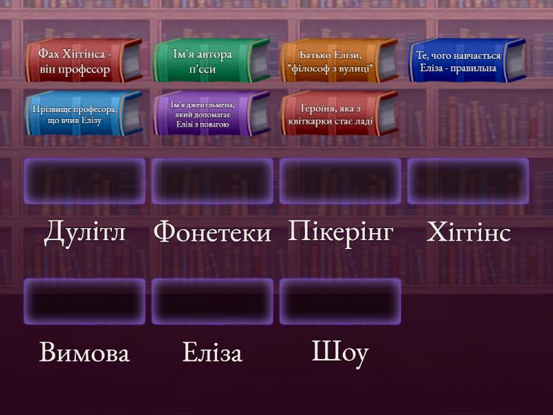 Героїня, яка з квіткарки стає ладі - Еліза, Ім'я автора п'єси - Шоу, Фах Хіггінса - він професор - Фонетеки, Ім'я джентльмена, який допомагає Елізі з повагою  - Пікерінг , Прізвище професора, що вчив Елізу - Хіггінс , Батько Елізи, "філософ з вулиці" - Дулітл , Те, чого навчається Еліза - правильна - Вимова,