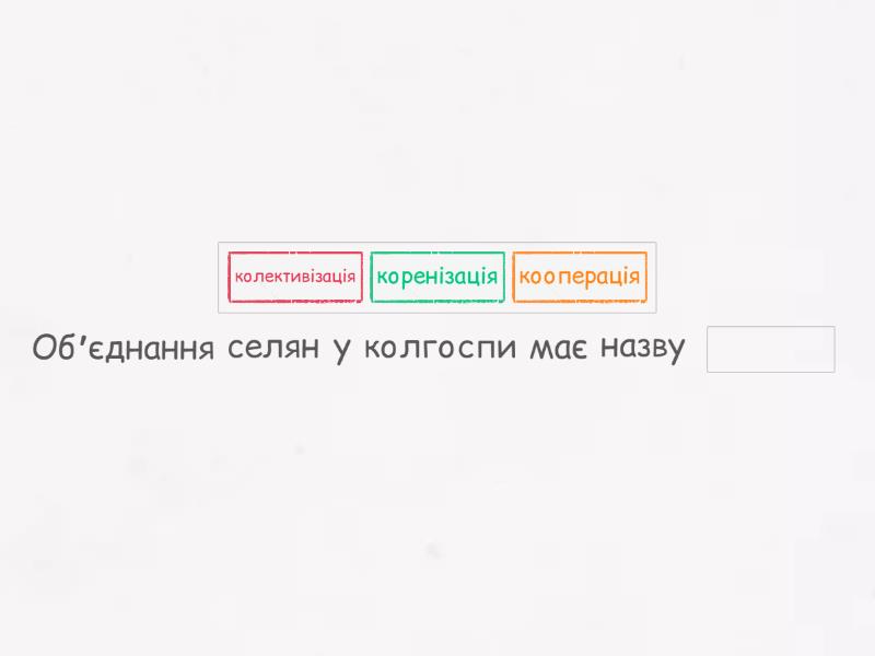 Об'єднання селян у колгоспи має назву ____ політика залучення національних кадрів до адміністративних посад мала назву ____ у часи громадянської війни більшовики проводили ____ під приводом боротьби з "ворогами народу" наприкінці 30-хх ____ Нова економічна політика передбачала ____ утвердження культу особи Сталіна відбулося ____ політика з будівництва великих підприємств мала назву ____