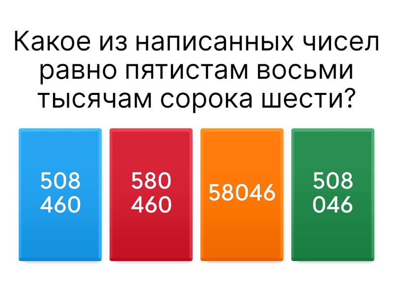 1) Какое из написанных чисел равно пятистам восьми тысячам сорока шести? a) 508 460 b) 580 460 c) 58046 d) 508 046 2) В ряду натуральных чисел непосредственно перед 230 010 стоит число: a) 230 009 b) 203 009 c) 23009 d) 230 099 3) Сумма чисел 64 765 и 42 846 равна: a) 107 601 b) 107 611 c) 107 610 d) 107 621 4) Разница между числами 53 562 и 34 474 составляет: a) 19 188 b) 19 198 c) 19 088 d) 19 189 5) Один множитель равен 2367, а другой — 8. Произведение равно: a) 16 936 b) 18 886 c) 18 963 d) 18 936 6) Число, которое в 7 раз больше 6439, это: a) 45 074 b) 45 075 c) 45 073 d) 45 037 7) Умножение чисел 24 508 и 6 равно: a) 147 480 b) 147 840 c) 147 048 d) 148 048 8) четверть 816 a) 224 b) 420 c) 240 d) 204 9) 2456•7+4544•7 a) 49 000 b) 490 000 c) 48 000 d) 480 000 10) ?:5=10 000-8345 a) 8275 b) 8225 c) 8255 d) 8257