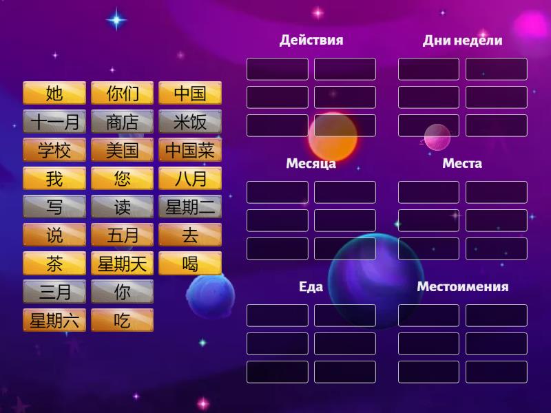 Действия: 去, 喝, 说, 写, 读, 吃, Дни недели: 星期六, 星期天, 星期二, Месяца: 五月, 八月, 十一月, 三月, Места: 学校, 中国, 美国, 商店, Еда: 米饭, 中国菜, 茶, Местоимения: 我, 你, 她, 您, 你们,
