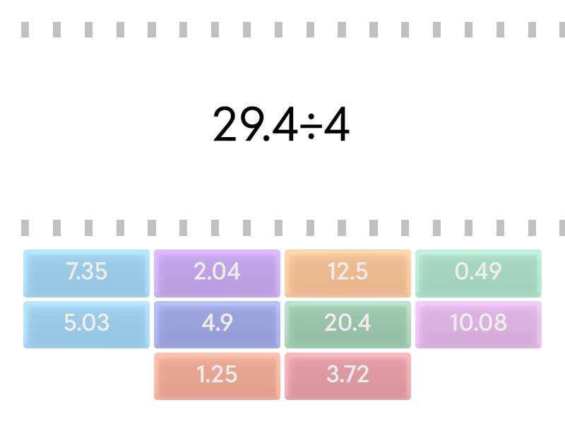 7.35 - 29.4÷4, 3.72 - 18.6÷5, 12.5 - 87.5÷7, 20.4 - 61.2÷3, 10.08 - 50.4÷5, 4.9 - 19.6÷4, 0.49 - 1.96÷4, 1.25 - 8.75÷7, 2.04 - 6.12÷3, 5.03 - 35.21÷7,