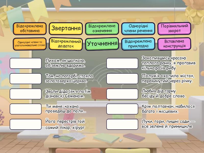 Відокремлене означення - Полум’я охопило місток, перекинутий через річку., Звертання - Ти мене, кохана, проведеш до поля..., Відокремлена обставина - Захопившись красою теплого ранку, я проґавив кілька разів рибу, Однорідні члени речення - Любив дід гарну бесіду й добре слово., Відокремлений додаток - Крім полтавчан, набилося багато і місцевих., Відокремлена прикладка - Його перестрів той самий лікар, хірург, Порівняльний зворот - Лихом, як шапкою, об землю вдаримо., Однорідні члени та узагальнювальне слово - Луки, гори, пишні сади — все зелене й принишкле, Уточнення - Там, на пагорбі, стояла золотоверха церква., Вставлена конструкція - Звали діда (як я потім дізнався) Семеном.,