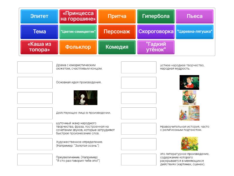 Фольклор - устное народное творчество, народная мудрость., Скороговорка - шуточный жанр народного творчества, фраза, построенная на сочетании звуков, которые затрудняют быстрое произнесение слов., Пьеса - это литературное произведение, содержание которого раскрывается в меняющихся действиях (картинах, сценах)., Притча - Нравоучительная история, часто с религиозным подтекстом., Комедия - Драма с юмористическим сюжетом, счастливым концом., Тема - Основная идея произведения., Эпитет - Художественное определение. (Например: "Золотая осень"), Гипербола - Преувеличение. (Например: "Я сто раз говорил тебе это!"), Персонаж - Действующее лицо в произведении., "Цветик-семицветик", "Гадкий утёнок", "Царевна-лягушка", «Каша из топора», «Принцесса на горошине»,