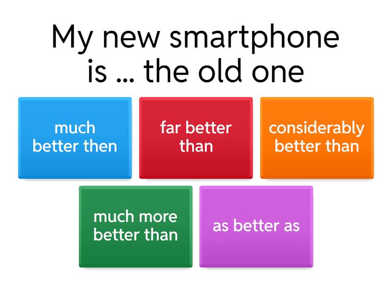 1) My new smartphone is ... the old one a) much better then b) far better than c) considerably better than d) much more better than e) as better as 2) He is still ... businessman in the world a) easily the richest b) by far the richest c) far the richest d) a lot the richest 3) It is usually ..... here than this summer a) a bit hotter b) a bit as hot c) as hot as d) slightly hot e) slightly hotter 4) The film is .... than the book a) as bad than b) slightly worser c) a bit worse d) a bit as bad as 5) We live ... from the sea than our friends a) more further b) much more further c) much further d) a lot more further e) far further f) by far further 6) Watching films in English is .... than in my own language a) slightly difficult b) more difficult c) a bit more difficult d) much difficult e) far more difficult