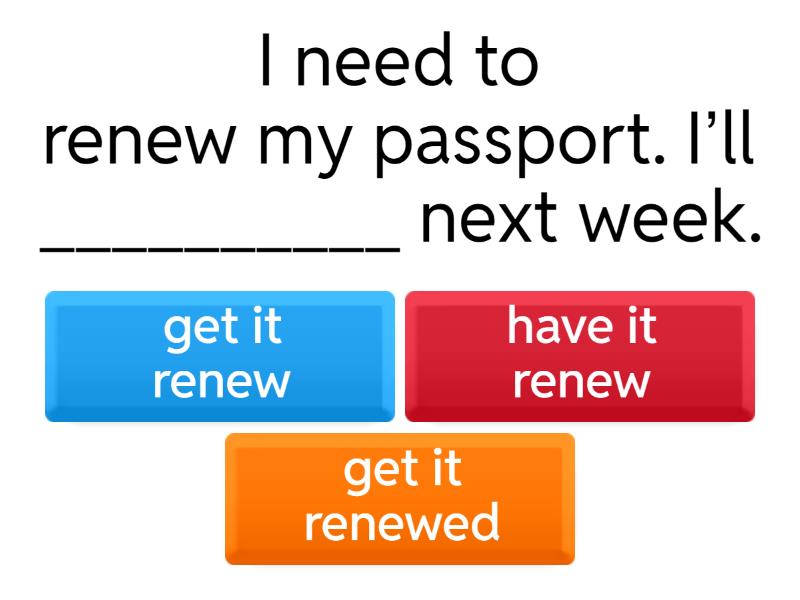 1) I need to renew my passport. I’ll __________ next week. a) get it renew b) have it renew c) get it renewed 2) She __________ her nails done every two weeks. a) gets b) makes c) does 3) We had our house __________ last summer. a) painting b) painted c) paint 4) He __________ his car repaired yesterday. a) asked b) had c) did 5) They’re going to __________ their kitchen remodeled. a) have b) get c) a and b are correct 6) I __________ the documents printed for the meeting. a) got b) made c) did 7) She usually __________ her hair cut at that salon. a) makes b) has c) does 8) We’ll __________ the invitations sent out tomorrow. a) do b) make c) have 9) I want to __________ my shoes cleaned before the party. a) get b) have c) a and b are correct 10) He never __________ his taxes done on time. a) have b) getting c) gets