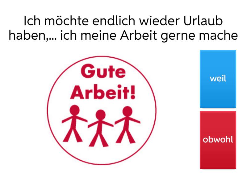 1) Ich möchte endlich wieder Urlaub haben,... ich meine Arbeit gerne mache a) weil b) obwohl 2) Ich möchte endlich wieder Urlaub haben,... ich lange keinen Urlaub mehr hatte. a) weil b) obwohl 3) Ich möchte endlich wieder Urlaub haben,... meine Kollegen sehr nett sind. a) weil b) obwohl 4) Ich möchte endlich wieder Urlaub haben,... ich in der letzten Woche viel gerbeitet habe. a) weil b) obwohl 5) Ich möchte endlich wieder Urlaub haben,... ich meinen Chef nicht mag. a) weil b) obwohl 6) Ich möchte endlich wieder Urlaub haben,... ich gerne in die USA reisen möchte. a) weil b) obwohl 7) Ich möchte endlich wieder Urlaub haben,... eine Urlaubsreise viel kostet. a) weil b) obwohl 8) Ich möchte endlich wieder Urlaub haben, ...es mit meinen Kindern nicht immer nur entspanned ist. a) obwohl b) weil 9) Ich möchte endlich wieder Urlaub haben,... meine Urlaubskasse leer ist. a) obwohl b) weil 10) Ich möchte endlich wieder Urlaub haben, ...ich meine Wohnung renovieren muss. a) obwohl b) weil