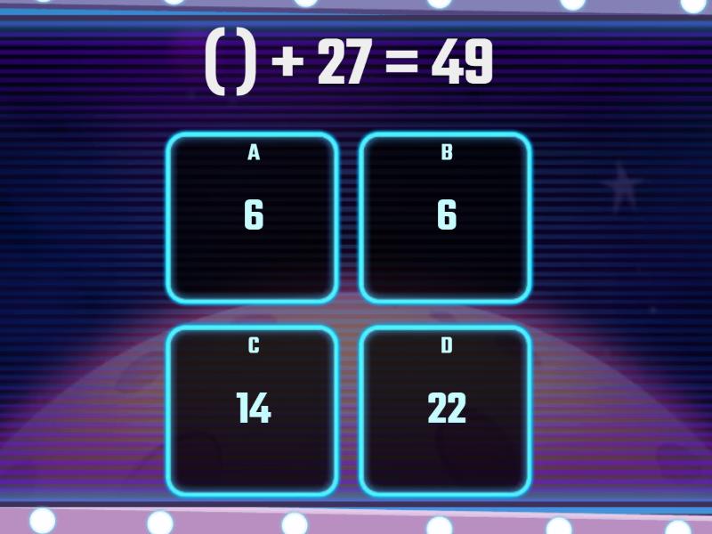 1) 15 + ( ) = 25 a) 6 b) 14 c) 97 d) 10 2) 28 + ( ) = 34 a) 83 b) 6 c) 22 d) 97 3) 36 - ( ) = 26 a) 6 b) 6 c) 10 d) 14 4) 45 - ( ) = 31 a) 14 b) 6 c) 83 d) 97 5) ( ) + 19 = 25 a) 6 b) 83 c) 97 d) 10 6) ( ) + 27 = 49 a) 6 b) 6 c) 14 d) 22 7) ( ) - 33 = 50 a) 83 b) 14 c) 10 d) 6 8) ( ) - 42 = 55 a) 97 b) 10 c) 83 d) 22