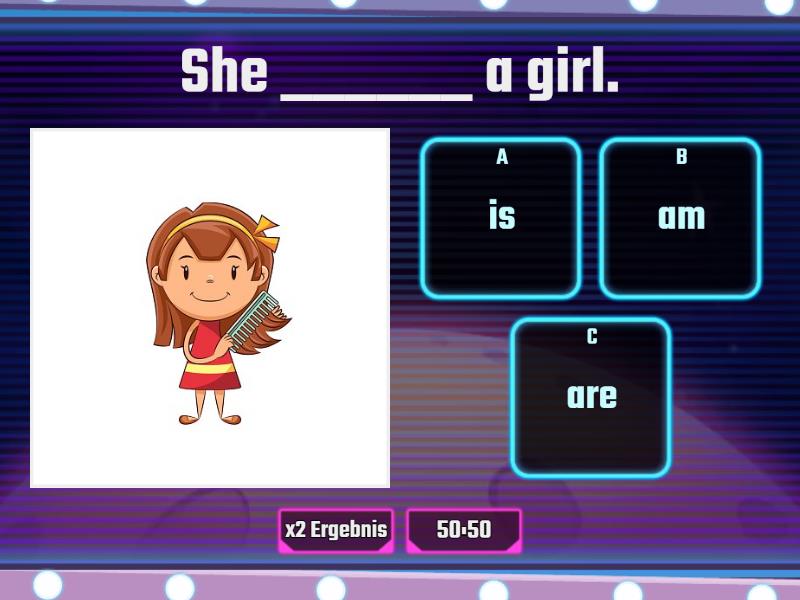 1) She ______ a girl. a) is b) am c) are 2) He _____ a boy. a) am b) is c) are 3) I ____ Elsa. a) am b) is c) are 4) You _____ seven years old. a) am b) is c) are 5) It ______ a schoolbag. a) is b) am c) are 6) It ______ a ruler. a) are b) is c) am 7) She _______ sad. a) am b) are c) is 8) It _______ a rubber. a) aren't b) is c) am not 9) You _______ 10 years old. a) is b) are c) am 10) I _______ a teacher. a) am b) is c) are