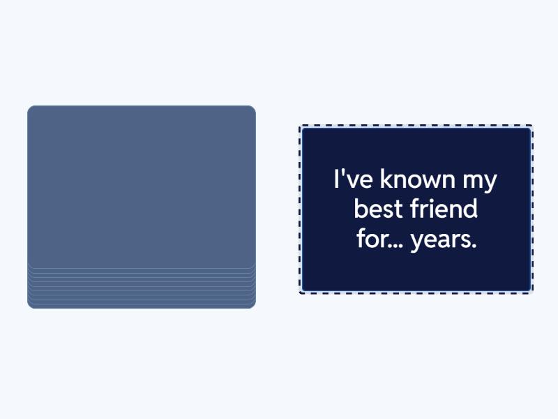 I've known my best friend for... years., I first met my friend in ..., My friend is a very ... person, Without friends I fee (lonely/sad/empty), I don't communicate with ... because..., I often chat with ... online\ofline, My parents and I usually ..., I can discuss ... with ..., I never tell... about ..., I like when my friend ..., I dislike when my parents....