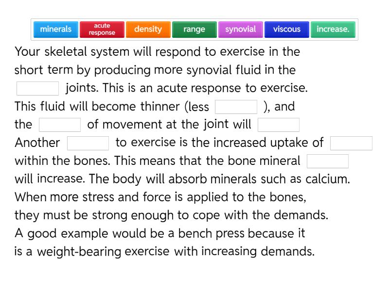 Your skeletal system will respond to exercise in the short term by producing more synovial fluid in the ____ joints. This is an acute response to exercise. This fluid will become thinner (less ____ ), and the ____ of movement at the joint will ____ Another ____ to exercise is the increased uptake of ____ within the bones. This means that the bone mineral ____ will increase. The body will absorb minerals such as calcium. When more stress and force is applied to the bones, they must be strong enough to cope with the demands. A good example would be a bench press because it is a weight-bearing exercise with increasing demands.