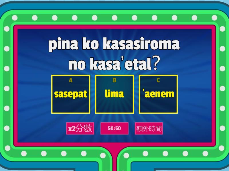 1) pina ko kasasiroma no kasa’etal? a) sasepat b) lima c) ’aenem 2) Onini a kakakonis to _____________ a) kasasiroma b) kasapimaan c) kasalipahak 3) o sa'osi no _________ no Ripon itiya ho. a) misalamaay b) mikingkiway c) mitiliday
