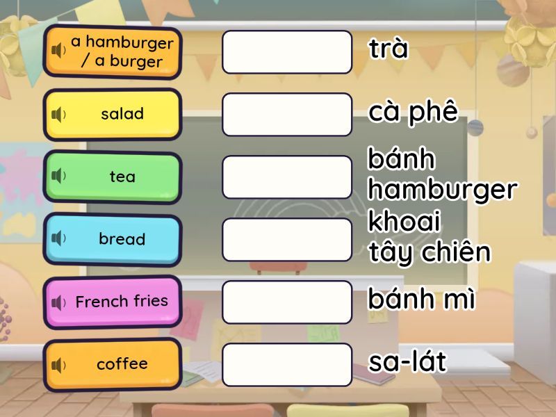 a hamburger / a burger - bánh hamburger, a sandwich - bánh sandwich, pizza - bánh pizza, salad - sa-lát, French fries - khoai tây chiên, bread - bánh mì, pasta - mì ống, rice - cơm, gạo, coffee - cà phê, tea - trà, soda - nước ngọt có gas, juice - nước ép,