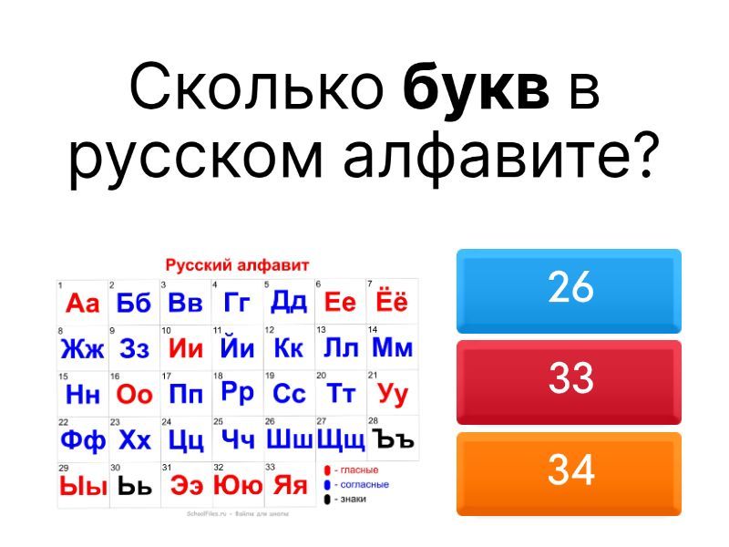 1) Сколько букв в русском алфавите? a) 26 b) 33 c) 34 2) Сколько гласных звуков? a) 6 b) 12 c) 10 3) Сколько гласных букв? a) 12 b) 6 c) 10 4) Выбери ряд гласных букв. a) А, Ь, О, И, Е, К, Ы, Т, Й, Э b) А, Я, О, Е, Ё, Э, Ы, И, У, Ю c) Т, Ж, Щ, Ц, Я, О, И, Ы, К, У 5) Сколько согласных букв? a) 28 b) 23 c) 21 6) Какие буквы не обозначают звуков? a) Ь и Ъ b) Ы , И c) Й, Ь 7) Какие бывают согласные? a) Звонкие и Глухие b) Глухие и Мягкие c) Звонкие и не глухие d) Мягкие и Твёрдые 8) Какие бывают согласные по звонкости и глухости? a) Парные и одиночные b) Парные и непарные c) Только парные 9) Выбери ПАРНЫЕ согласные по глухости и звонкости. a) Ц, Х, Л, Й, М, Р, Ч, Щ, Н b) Б, В, Г, Д, Ж, З, С, П, Ф, К, Т, Ш, С c) М, Р, Ч, Щ, Н, Д, Ж, З, С, Ф, К 10) Выбери НЕПАРНЫЕ согласные по глухости и звонкости. a) Л, М, Н, Р, Й, Х, Ц, Ч, Щ b) Б, В, Г, Д, Ж, З, С, Ф, К, Т, Ш, С c) М, Р, Ч, Щ, Н, Д, Ж, З, С, Ф, К 11) Какие согласные всегда ТВЁРДЫЕ? a) Л, М, Н, b) Ж, Ш, Ц c) Ч, Щ, Й 12) Какие согласные всегда МЯГКИЕ? a) Ч, Щ, Й b) Ж, Ш, Ц c) Д, П, С 13) Какие гласные обозначают 2 звука? a) А, О, У, И, Ы, Э b) Я, Е, Ё, Ю c) Э, Ю, Е, Ы , О 14) Какие согласные шипящие? a) Ж, Ш, Ч, Щ b) Ц, Ж, Ш, Й c) Г, Ф, Х, Ц 15) Какие две функции в слове выполняет Ь мягкий знак? a) Не обозначает мягкость согласного b) Обозначает мягкость согласного c) Отделяет согласные буквы от гласных е, ё, и, ю, я d) Не отделяет согласные буквы от гласных е, ё, и, ю, я 16) Что такое слог? a) Это один ГЛАСНЫЙ Звук или сочетание звуков в слове. b) Это два гласных звука или сочетание одного или нескольких согласных. 17) В слове столько слогов, ... a) сколько гласных букв b) сколько согласных букв 18) Какие бывают слоги? a) Открытые и закрытые b) Только открытые c) Только закрытые 19) Какие бывают слоги? a) Только ударные b) Ударные и безударные c) Только безударные 20) Фонетика – это раздел русского языка, который a) изучает звуки и буквы b) изучает грамматику