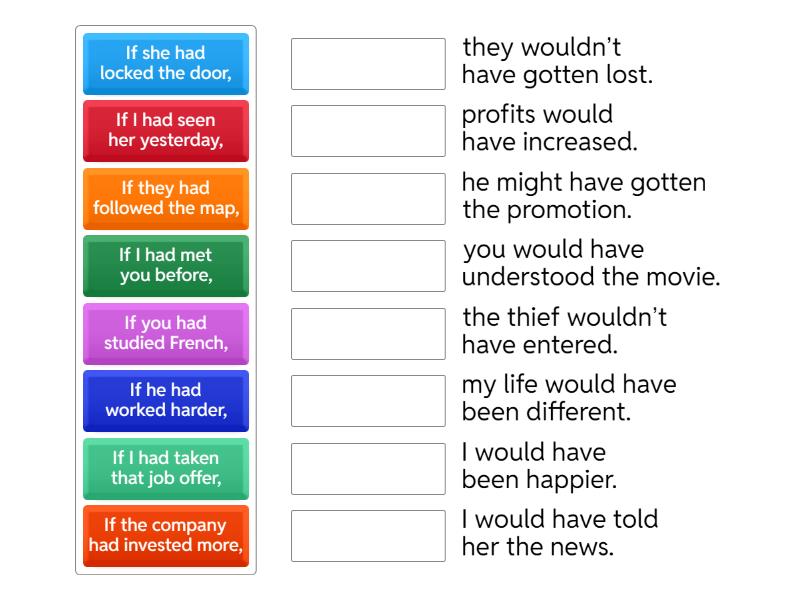 If I had seen her yesterday, - I would have told her the news., If he had worked harder, - he might have gotten the promotion., If they had prepared well, - they would have done better in the presentation., If she had locked the door, - the thief wouldn’t have entered., If we had gone to bed earlier, - we wouldn’t have been so tired., If you had studied French, - you would have understood the movie., If the company had invested more, - profits would have increased., If I had met you before, - I would have been happier., If they had followed the map, - they wouldn’t have gotten lost., If I had eaten breakfast, - I wouldn’t have felt hungry., If she had listened to the doctor, - she would have recovered faster., If we had bought the house last year, - it would have been cheaper., If the students had revised more, - they would have passed the test., If he had called earlier, - we could have helped him., If I had taken that job offer, - my life would have been different.,