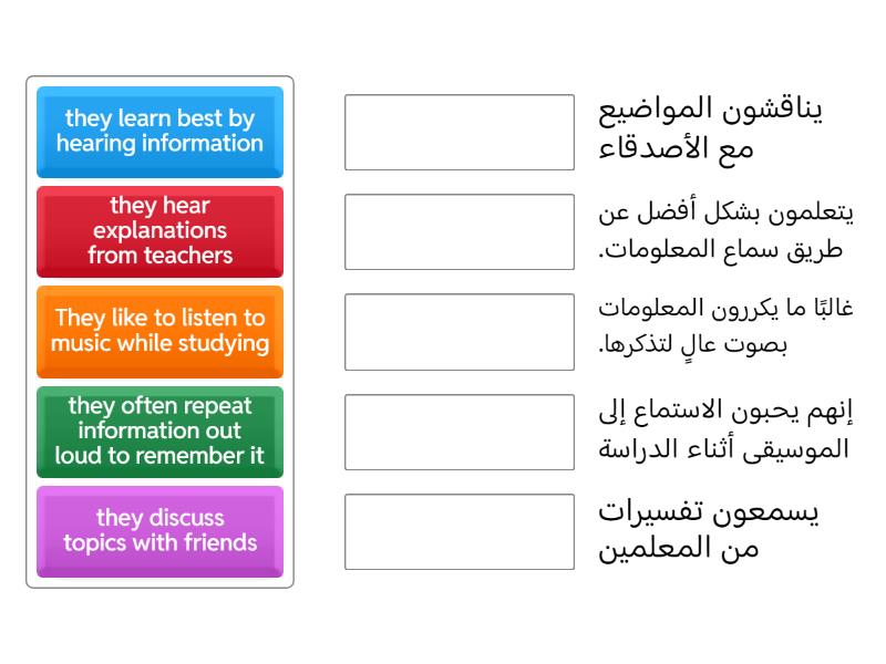 they learn best by hearing information - يتعلمون بشكل أفضل عن طريق سماع المعلومات., They like to listen to music while studying - إنهم يحبون الاستماع إلى الموسيقى أثناء الدراسة, they discuss topics with friends - يناقشون المواضيع مع الأصدقاء, they hear explanations from teachers - يسمعون تفسيرات من المعلمين, they often repeat information out loud to remember it - غالبًا ما يكررون المعلومات بصوت عالٍ لتذكرها.,