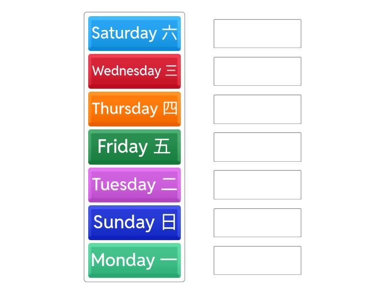 Monday 一, Tuesday 二, Wednesday 三, Thursday 四, Friday 五, Saturday 六, Sunday 日.
