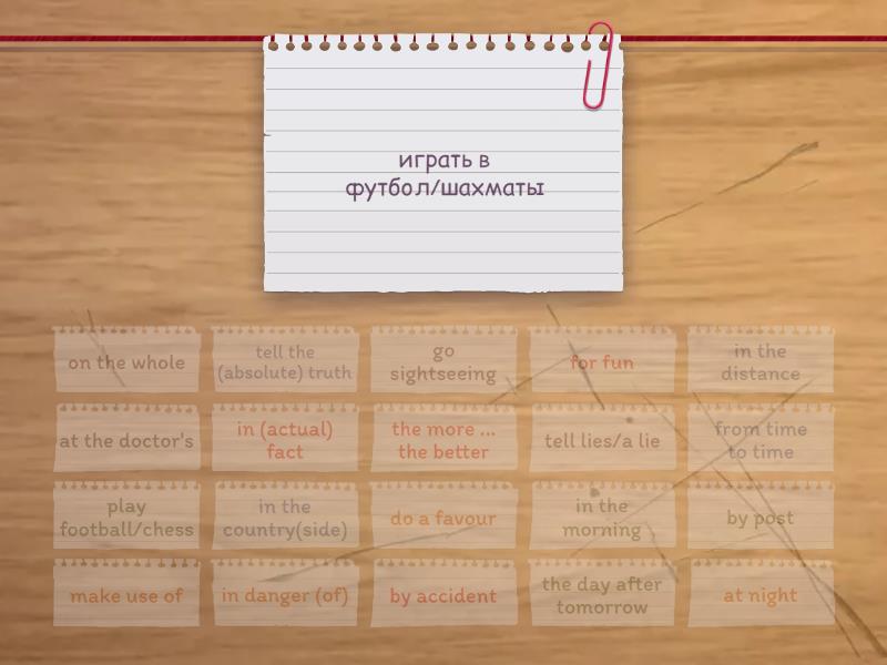 play football/chess - играть в футбол/шахматы, the more ... the better - чем больше ... тем лучше, do a favour - оказывать услугу, from time to time - время от времени, tell lies/a lie - лгать, the day after tomorrow - послезавтра, in (actual) fact - фактически, at night - ночью, tell the (absolute) truth - говорить (чистую) правду, go sightseeing - осматривать достопримечательности, in the morning - утром, for fun - ради шутки, make use of - пользоваться, in the country(side) - в сельской местности, on the whole - в целом, by post - по почте, by accident - нечаянно, in danger (of) - в опасности, in the distance - вдали, at the doctor's - у врача,