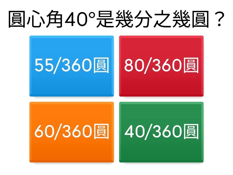 1) 圓心角40°是幾分之幾圓? a) 55/360圓 b) 80/360圓 c) 60/360圓 d) 40/360圓 2) 組成扇形的要素有哪些? a) 半徑 b) 圓心 c) 圓弧 d) 圓規 3) 一個圓內的任兩條線及其所夾的圓弧所圍成的區域,稱為扇形 a) O b) X 4) 一個1/20圓的扇形,它的圓心角是幾度? a) 15° b) 12° c) 18° d) 16° 5) 一個圓中的任意兩條半徑,可以將這個圓切成兩個扇形。 a) X b) O 6) 圓心角20°是幾分之幾圓? a) 20/360圓 b) 50/360圓 c) 40/360圓 d) 90/360圓 7) 一個1/5圓的扇形,它的圓心角是幾度? a) 70° b) 60° c) 72° d) 30° 8) 一個以圓心為頂點,兩條半徑為邊,再加上弧所圍成的封閉的圖形稱為扇形? a) O b) X 9) 一個1/10圓的扇形,它的圓心角是幾度? a) 40° b) 60° c) 20° d) 36° 10) 圓心角45°是幾分之幾圓? a) 100/360 b) 150/360 c) 45/360 d) 76/360 11) 甜點師傅將一個圓形蛋糕切成圓心角都是40度的扇形蛋糕片,共可以切成幾片?每片都是幾分之幾圓? a) 7片,2/9圓 b) 8片,1/8圓 c) 10片,3/8圓 d) 9片,1/9圓 12) 從下午1點到下午5點,時針經過的扇形區域會是幾分之幾? a) 1/12 b) 2/12 c) 4/12 d) 3/12 13) 有ㄅ、ㄆ兩個相同半徑的扇形,扇形ㄅ是1/20圓,扇形ㄆ比扇形ㄅ的圓心角大 90度,扇形ㄆ的圓心角是幾度? a) 100° b) 108° c) 110° d) 115