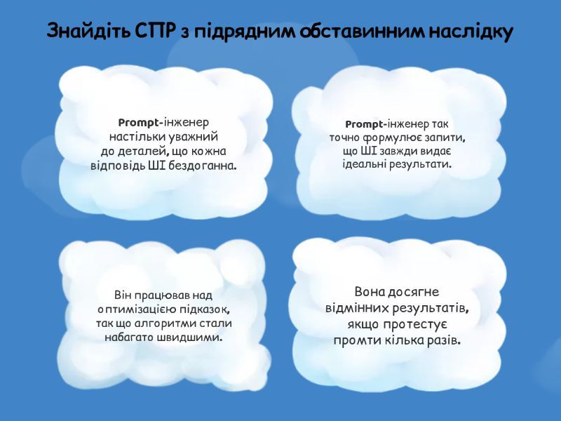 1) Знайдіть СПР з підрядним обставинним наслідку a) Prompt-інженер настільки уважний до деталей, що кожна відповідь ШІ бездоганна. b) Prompt-інженер так точно формулює запити, що ШІ завжди видає ідеальні результати. c) Він працював над оптимізацією підказок, так що алгоритми стали набагато швидшими. d) Вона досягне відмінних результатів, якщо протестує промти кілька разів. 2) Знайдіть СПР з підрядним обставинним наслідку a) Якщо він структурує дані логічно, алгоритм швидко обробить інформацію. b) Вона створила структуровані промти, так що результат вийшов надзвичайно точним. c) Він тестує запити методом проб і помилок, щоб знайти найефективніший підхід. d) Він працює так інтенсивно, що генерує сотні запитів за день. 3) Знайдіть СПР з підрядним обставинним наслідку a) Prompt-інженер контролює алгоритм настільки досконало, що результати завжди очікувані. b) Вона створила структуровані промти - і результат вийшов надзвичайно точним. c) Prompt-інженер постійно вдосконалює свої запити, так що команда отримує більше корисної інформації. d) Він перевіряє дані так, щоб алгоритм не витрачав час на зайву обробку. 4) Знайдіть СПР з підрядним обставинним наслідку a) Він експериментує з формулюваннями настільки вправно, що ШІ видає унікальні відповіді. b) Він удосконалив запити — і система почала працювати без помилок c) Він змінює формулювання запитів, бо ШІ іноді неправильно розуміє суть питання. d) Він налаштував промти настільки грамотно, так що система відповідає без помилок. 5) Знайдіть СПР з підрядним обставинним наслідку a) Вона стільки експериментує з промтами, так що її результати викликають захоплення навіть у колег. b) Prompt-інженер ретельно тестує алгоритми, тому що від цього залежить точність роботи. c) Вона перевіряє промти настільки прискіпливо, що жоден нюанс не залишається непоміченим. d) Якщо він структурує дані логічно, алгоритм швидко обробить інформацію. 6) Знайдіть СПР з підрядним обставинним наслідку a) Prompt-інженер захоплюється своєю роботою, так що іноді забуває про час. b) Prompt-інженер настільки глибоко розуміє логіку ШІ, що здатен передбачити навіть неочікувані відповіді. c) Prompt-інженер формулює запити так, як музикант налаштовує інструмент — точно й гармонійно. d) Prompt-інженер постійно навчається, тому що технології змінюються щодня. 7) Частини складного речення поєднані сполучником чи сполучним словом? Він настільки вдосконалив систему запитів, так що програма тепер працює в кілька разів швидше. a) сполучником b) сполучним словом 8) У якій позиції знаходиться підрядна частина? Він настільки добре розуміє логіку моделей, так що може передбачити їхню реакцію на будь-який запит. a) перед головною b) після головної 9) Визначте вид речення: Вона постійно вивчає нові алгоритми, тому що хоче вдосконалювати свою роботу, так що її результати завжди вражають команду. a) СПР з однією підрядною частиною b) СПР з кількома підрядними частинами 10) Визначте вид речення: Він уважно аналізує відповіді ШІ, бо знає, як важлива точність, так що помилок у його проєктах майже не буває. a) СПР з однією підрядною частиною b) СПР з кількома підрядними частинами 11) Це СПР з підрядним обставинним наслідку? Вона настільки захоплена своїм проєктом, що навіть уві сні думає про нові формулювання. a) так b) ні 12) Це СПР з підрядним обставинним наслідку? Вона оптимізувала алгоритм запитів, так щ