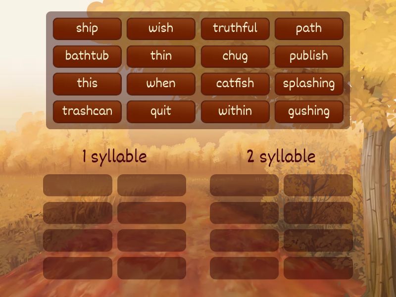 1 syllable: chug, ship, this, quit, path, wish, when , thin, 2 syllable: catfish, bathtub, trashcan, within, gushing, splashing, publish, truthful,