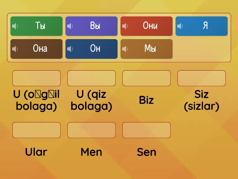 Я - Men, Ты - Sen, Он - U (oʻgʻil bolaga), Она - U (qiz bolaga), Мы - Biz, Вы - Siz (sizlar), Они - Ular,