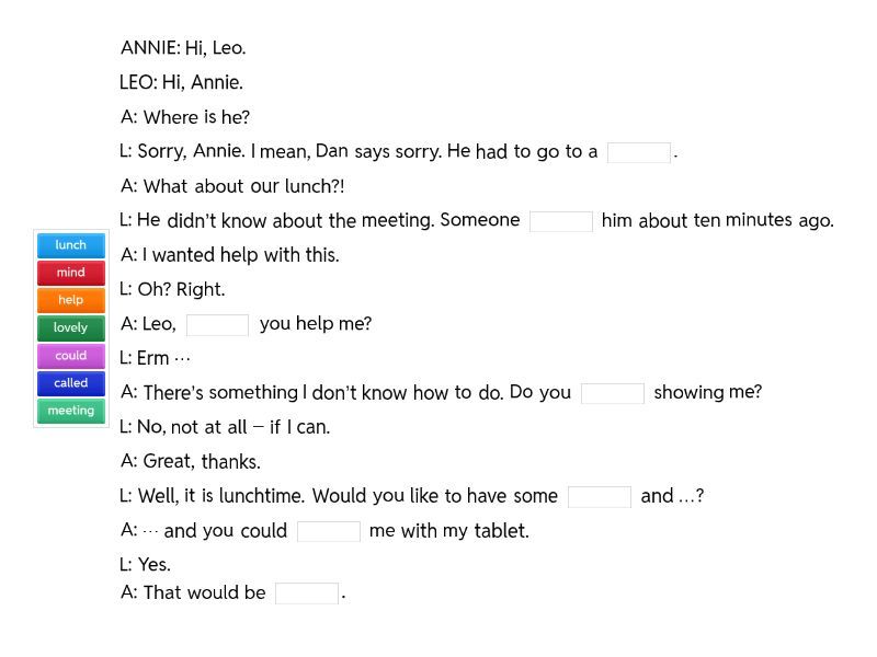 ANNIE: Hi, Leo. LEO: Hi, Annie. A: Where is he? L: Sorry, Annie. I mean, Dan says sorry. He had to go to a ____. A: What about our lunch?! L: He didn’t know about the meeting. Someone ____ him about ten minutes ago. A: I wanted help with this. L: Oh? Right. A: Leo, ____ you help me? L: Erm … A: There’s something I don’t know how to do. Do you ____ showing me? L: No, not at all – if I can. A: Great, thanks. L: Well, it is lunchtime. Would you like to have some ____ and …? A: … and you could ____ me with my tablet. L: Yes. A: That would be ____.
