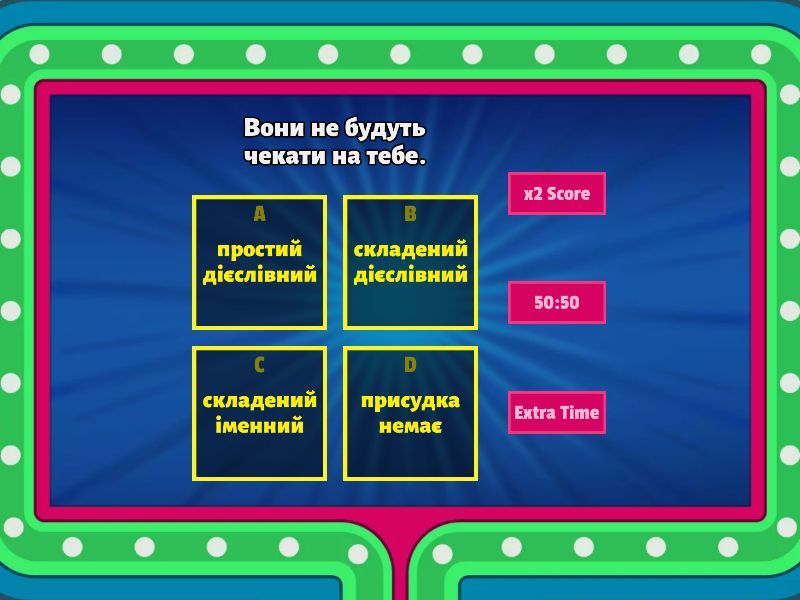 1) Вони не будуть чекати на тебе. a) простий дієслівний b) складений дієслівний c) складений іменний d) присудка немає 2) Вони не хочуть чекати на тебе. a) простий дієслівний b) складений іменний c) складений дієслівний 3) Вони не зможуть чекати на тебе. a) простий дієслівний b) складений іменний c) складений дієслівний 4) Ми закінчили вчити морфологію. a) простий дієслівний b) складений іменний c) складений дієслівний 5) Брат став істориком. a) простий дієслівний b) складений іменний c) складений дієслівний 6) Йому спекотно в цьому одязі. a) простий дієслівний b) складений іменний c) складений дієслівний 7) Мрія здавалася нездійсненною. a) простий дієслівний b) складений іменний c) складений дієслівний 8) Легкий тест. a) простий дієслівний b) складений іменний c) складений дієслівний d) присудка немає 9) Тест легкий. a) простий дієслівний b) складений іменний c) складений дієслівний d) присудка немає 10) Надійка була найгарнішою з-поміж усіх гостей. a) простий дієслівний b) складений іменний c) складений дієслівний d) присудка немає