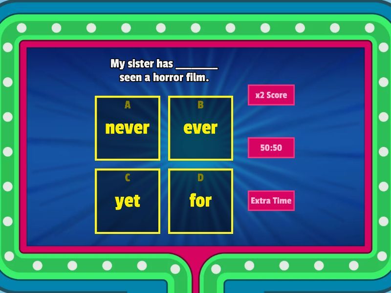 1) My sister has ________ seen a horror film. a) never b) ever c) yet d) for 2) Jane ________France yet. a) hasn't been visiting b) haven't visited c) hasn't visited d) haven't been visiting 3) The hikers have _______Mount Everest for the last two weeks. a) climbed b) have climbed c) climbing d) been climbing 4) They have_________all the members of the club, but no one can come to the meeting. a) be calling b) called c) calling d) being calling 5) _________ long has that actress been appearing on this TV series? a) How b) All c) For d) From 6) Mum ________the market to buy some vegetables. a) has been going to b) has gone to c) has gone in d) has been going in 7) ________to take her karate uniform to class? a) Has she been remembering b) She has remembered c) She has been remembering d) Has she remembered 8) Tim________for Channel 6 news for 20 years. a) has reported b) has been reporting c) reporting d) reported 9) My parents_________at a hotel in a long time because they prefer camping. a) haven't been staying b) didn't stay c) haven't stayed d) not been staying 10) Colin_________Amsterdam since 2015. a) has been in b) has gone to c) has been to d) has gone in 11) We haven't been to the ski resort________last winter. a) before b) already c) for d) since 12) David______a new house for the past six months. a) has built b) has been building c) built d) been building
