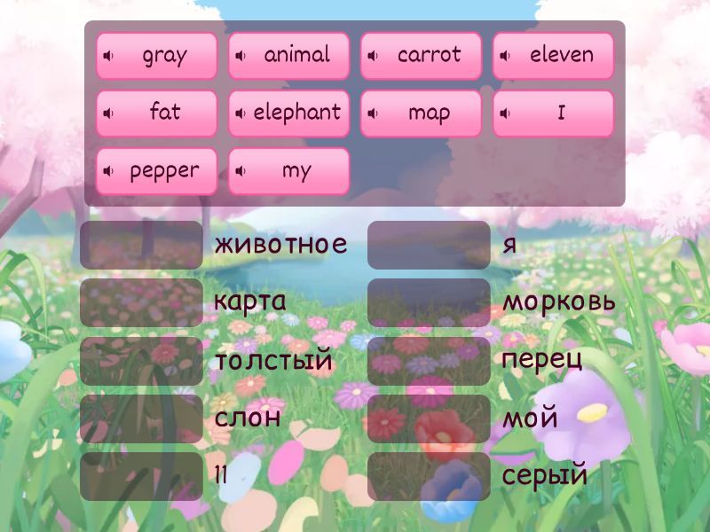 I - я, my - мой, map - карта, animal - животное, elephant - слон, eleven - 11, fat - толстый, carrot - морковь, gray - серый, pepper - перец,