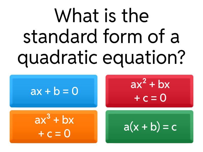 1) What is the standard form of a quadratic equation? a) ax + b = 0 b) ax² + bx + c = 0 c) ax³ + bx + c = 0 d) a(x + b) = c 2) In the quadratic equation ax² + bx + c = 0, what does the discriminant represent? a) The average of the roots b) The sum of the coefficients c) The nature of the roots d) The slope of the line 3) If the discriminant is positive, what does it tell about the roots? a) One real root b) Two equal real roots c) Two distinct real roots d) No real roots 4) If the discriminant is zero, then the quadratic equation has: a) Two distinct real roots b) Two equal real roots c) Complex roots d) No solution 5) If the discriminant is negative, then the roots are: a) Equal and real b) Distinct and real c) Imaginary or complex d) Undefined 6) The sum of the roots of ax² + bx + c = 0 is given by: a) b/a b) - a/b c) c/a d) - c/a 7) The product of the roots of ax² + bx + c = 0 is: a) c/a b) - c/a c) b/a d) - b/a 8) The quadratic function y = ax² + bx + c opens upward when: a) a=0 b) a>0 c) a<0 d) b>0 9) The quadratic function y = ax² + bx + c opens downward when: a) a>0 b) a=0 c) a<0 d) b<0 10) The vertex form of a quadratic function is: a) y = ax² + bx + c b) y = a(x − h)² + k c) y = ax + b d) y = a(x + b)² + c 11) The axis of symmetry of the parabola y = ax² + bx + c is given by: a) x = -b / 2a b) y = -b / 2a c) x = b / 2a d) y = b / 2a 12) Which of the following represents the set notation for the interval (−3,5]? a) {x ∣ −3 < x ≤ 5} b) {x ∣ −3 ≤ x < 5} c) {x ∣ −3 ≤ x ≤ 5} d) {x ∣ −3 < x < 5} 13) Which of the following is the interval notation for {x ∣ x ≥ −2}? a) (−2,∞) b) [−2,∞) c) (−∞,−2) d) (−∞,−2] 14) Which inequality symbol represents the solution set that includes the boundary? a) < b) > c) ≥ d) None of the above 15) The discriminant of ax2 + bx + c = 0 is given by: a) b² + 4ac b) b² − 4ac c) -b² − 4ac d) a² − 4bc