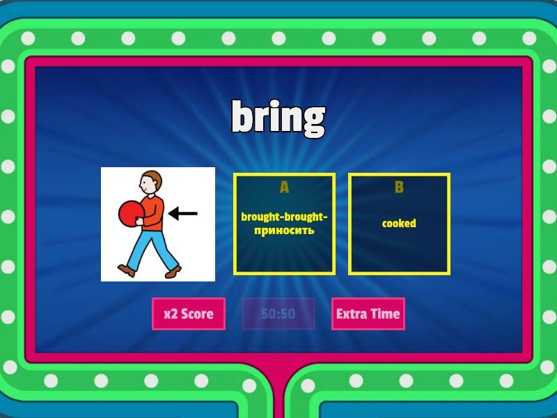 1) bring a) brought-brought- приносить b) cooked 2) cook a) cooked b) put-put- класть 3) chop a) chopped b) cooked c) put-put- класть 4) put a) put-put- класть b) mixed 5) mix a) mixed b) put 6) make a) made-made делать b) put-put- класть 7) bake a) baked- печь b) put-put- класть 8) I'm starving a) я голоден b) я сыт c) класть 9) set the table a) set-set накрывать b) put-put- класть 10) full a) пустой b) полный 11) leave -оставлять, покидать a) left-left b) made-made 12) argue- спорить a) argued b) peeled 13) peel a) peeled b) argued