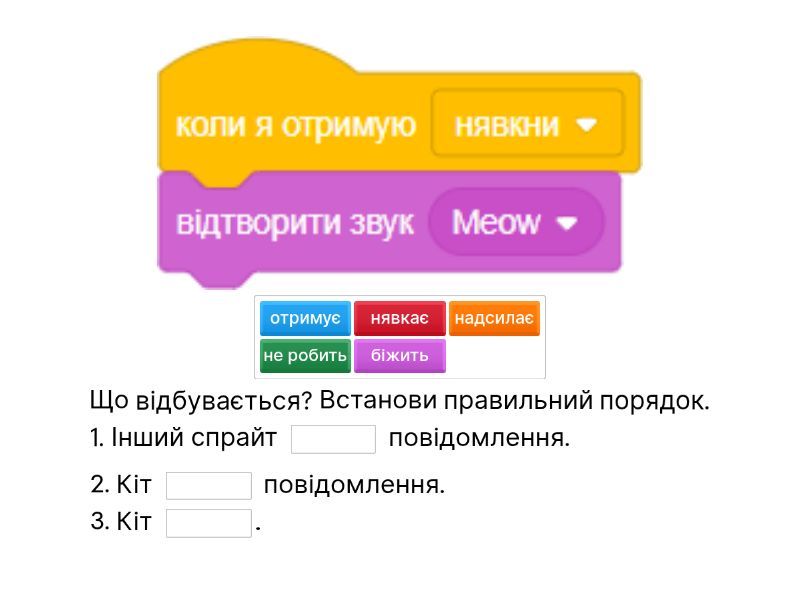 Що відбувається? Встанови правильний порядок. 1. Інший спрайт ____ повідомлення. 2. Кіт ____ повідомлення. 3. Кіт ____. Що відбувається? Встанови правильний порядок. 1. Балерина ____. 2. Балерина ____. 2. Кіт ____. Що відбувається? Встанови правильний порядок. 1. Балерина ____. 2. Кіт ____. 3. Балерина ____. Що відбувається? Встанови правильний порядок. 1. Балерина ____. 2. Балерина ____. 3. Кіт ____.