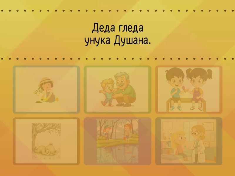 Деда гледа унука Душана., Давид и Драгана се диве Дунаву., Влада и Доротеа једу сладолед., Нада данас сади дрво., Медвед дрема испод дрвета., Радмила је код доктора.,