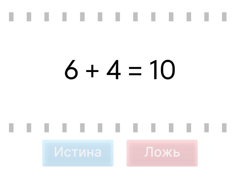 Истина: 6 + 4 = 10, 3 + 7 = 10, 5 + 3 = 8, 5 + 4 = 9, Ложь: 5 + 3 = 9, 2 + 7 = 10, 4 + 4 =7,
