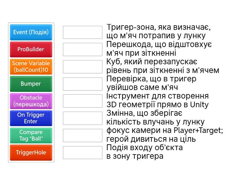 Event (Подія) - фокус камери на Player+Target; герой дивиться на ціль, TriggerHole - Тригер-зона, яка визначає, що м’яч потрапив у лунку, Ball (М’яч) - Об’єкт із Rigidbody, який рухається фізично, ProBuilder - Інструмент для створення 3D геометрії прямо в Unity, Boolean (CSG) Tool → Subtraction - Створення отвору лунки, віднімаючи циліндр від куба, On Trigger Enter - Подія входу об’єкта в зону тригера, On Collision Enter - Подія при зіткненні м’яча з перешкодою, On Trigger Exit - Подія, що спрацьовує, коли м’яч виходить із лунки, Compare Tag “Ball” - Перевірка, що в тригер увійшов саме м’яч, Scene Variable (ballCount)10 - Змінна, що зберігає кількість влучань у лунку, Obstacle (перешкода) - Куб, який перезапускає рівень при зіткненні з м’ячем, Load Scene (Scene Build Index 0) - Перезавантаження поточного рівня, Bumper - Перешкода, що відштовхує м’яч при зіткненні, Drag - Опір, який сповільнює м’яч під час руху, Par Score - Кількість ударів, за яку треба потрапити в лунку,