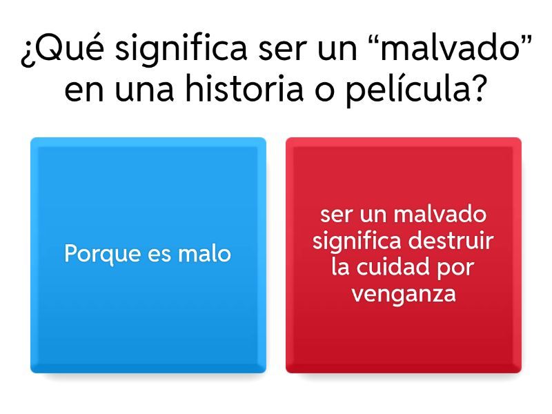 1) ¿Qué significa ser un “malvado” en una historia o película? a) Porque es malo b) ser un malvado significa destruir la cuidad por venganza 2) ¿Por qué crees que algunos personajes deciden ser malos? a) porque si b) porque en su infancia sufrio algo malo 3) Nombra un villano famoso de una película que conozcas a) Nose b) Gaston 4) ¿Qué cosas malas hace ese villano? a) Nose b) Burlarse, Destruir el mundo ,matar a cualquier persona 5) Crees que un malvado puede cambiar y ser bueno? ¿Por qué? a) nose b) si porque si lo derrotan