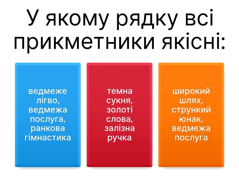1) У якому рядку всі прикметники якісні: a) ведмеже лігво, ведмежа послуга, ранкова гімнастика b) темна сукня, золоті слова, залізна ручка c) широкий шлях, стрункий юнак, ведмежа послуга 2) У якому рядку всі прикметники відносні: a) літальний апарат, польова дорога, залізна ручка b) ведмеже лігво, чоловічий костюм, сталева пружина c) лисий чоловік, вовчий апетит, малинова сукня 3) У якому рядку всі прикметники присвійні: a) білявий хлопчина, недільний ранок, сестрина хустка b) вовчий хвіст, чоловіків светр, Петрів шарф c) мій зошит, мамин шарф, вовчий апетит 4) Від яких якісних прикметників у рядку не творяться ступені порівняння: a) малиновий, пречудовий, мамин b) глухий, холоднуватий, білосніжний c) дорогий, дужий, старший 5) У якому рядку всі прикметники утворені вищим ступенем порівняння: a) найкращий, найбільш вдалий, найменш привабливий b) менш смачний, найменш дорогий, стриманий c) більш добрий, менш близький, слухняніший 6) У якому рядку всі прикметники утворені найвищим ступенем порівняння: a) найбільший, щонайважчий, найменш смачний b) найбільш стриманий, менш захопливий, дорожчий c) більш важкий, менш розумний, більш далекий 7) Укажіть рядок, у якому неправильно утворено ступені порівняння прикметників: a) більш добріший, самий кращий, найбільш вразливіший b) найбільш вразливий, найвідоміший, брат старший, ніж я c) брат старший за мене, більш добрий, найбільш вразливий 8) Укажіть рядок, у якому правильно утворено ступені порівняння прикметників: a) найбільш вразливіший, смачніший, найкращий b) найбільш відомий, менш добрий, сестра молодша, ніж я c) холоднуватий, самий відомий, найбільш яскравіший 9) До твердої групи належать усі прикметники в рядку: a) дружній, недільний, мужній b) попутній, суботній, майбутній c) заробітний, природний, дружний 10) До мʼякої групи належать усі прикметники в рядку: a) безробітний, придорожній, хатній b) дорожній, сінешній, літній c) прийдешній, безодній, народний 11) У якому рядку всі прикметники слід писати через дефіс: a) кисло солодкий, далекий предалекий, мовнолітературний b) червоногарячий, військовозобовʼязаний, українськогрузинський c) кисломолочний, сніжнобілий, білосніжний 12) У якому рядку всі прикметники слід писати разом: a) синьожовтий, прямопропорційний, народно пісенний b) тридцяти тисячний, історико культурний, військовослужбовець c) західно європейський, військово полонений, вище згаданий