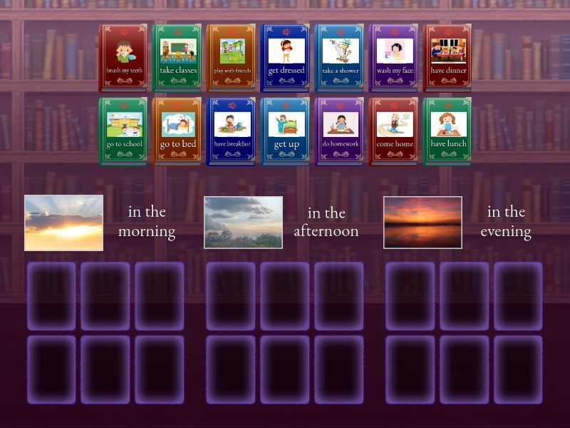 in the morning: get up, have breakfast, brush my teeth, wash my face, get dressed, go to school, in the afternoon: take classes, have lunch, play with friends , come home, in the evening: have dinner, go to bed, take a shower, do homework,