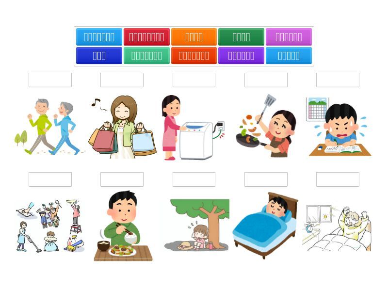 しゅくだいします, せんたくします, ねます, おきます, りょうりします, さんぽします, かいものします, そうじします, たべます, やすみます,