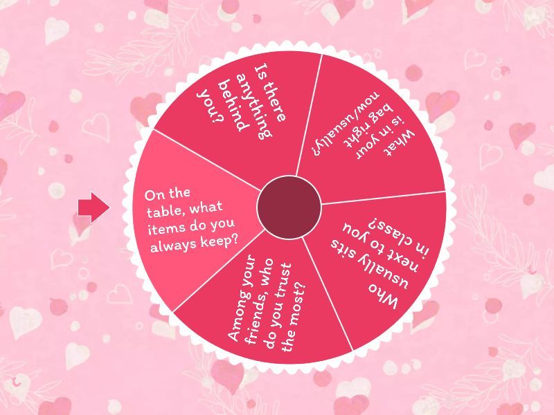 1) Is there anything behind you? 2) What is in your bag right now/usually? 3) Who usually sits next to you in class? 4) Among your friends, who do you trust the most? 5) On the table, what items do you always keep?