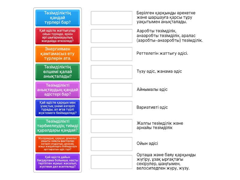 Денеге түсетін жалпы жүктемені сипаттайтын қандай компоненттер бар? - Қарқындылығы, ұзақтығы, қайталау саны, демалыс аралығының ұзақтығы, демалыс сипаты., Физикалық қасиеттерді дамытудың негізгі әдістеріне қандай әдістер жатады? - Біркелкі, қайталанатын, айнымалы, бақылау, интервалдық, реттелетін жаттығу, стандартты-қайта жаттығу, ауыспалы жаттығу, дөңгелек жаттығу, бәсекеге қабілетті., Қай әдісте жаттығу ылғи бір қарқынмен өтеді, ал мақсаты – төзімділікті арттыру? - Біркелкі әдіс, Қай әдісте қарқын мен ұзақтық үнемі өзгеріп тұрады, ал ағза түрлі жүктемеге бейімделеді? - Айнымалы әдіс, Қай әдісте дайын бағдарлама бойынша, нақты тәртіппен жұмыс жасалып, жүктеме дәл есептеледі? - Реттелетін жаттығу әдісі., Қай әдісте жаттығулар ойын түрінде, еркін әрі шығармашылық жағдайда өткізіледі? - Ойын әдісі, Егер жаттығулар жарысқа ұқсас жағдайда өткізіліп, спортшы ең жоғары нәтижеге ұмтылса, бұл қандай әдіс? - Бәсекелік әдіс, Егер сен бір қашықтықты бірнеше рет жүгіріп, әр айналымнан соң демалып алсаң — бұл қандай жаттығу тәсілі деп аталады? - Қайталанатын әдіс, Жылдамдық, қарқын, демалыс уақыты сияқты факторлар өзгеріп отыратын, дененің жаңа жағдайларға бейімделуін арттыратын әдіс түрі? - Вариативті әдіс, Жаттығу барысында жұмыс пен демалыс кезеңдері қатаң тәртіппен реттеліп, демалыс уақыты біртіндеп азайтылатын әдіс қалай аталады? - Интервалдық әдіс, Төзімділіктің өлшемі қалай анықталады? - Берілген қарқынды әрекетке және шаршауға қарсы тұру уақытымен анықталады., Төзімділікті анықтаудың қандай әдістері бар? - Түзу әдіс, жанама әдіс, Төзімділіктің қандай түрлері бар? - Жалпы төзімділік және арнайы төзімділік, Арнайы төзімділіктің түрлерін ата. - Шапшаңдық төзімділігі, күш төзімділігі, шапшаңдық-күш төзімділігі, статикалық күш төзімділігі, аралас төзімділік., Төзімділікті тәрбиелеудің тиімді құралдары қандай? - Орташа және баяу қарқынды жүгіру, ұзақ ырғақтағы секірулер, шаңғымен, велосипедпен жүру, жүзу., Бастауыш сыныптарда төзімділікті қалай дамытуға болады? - Қозғалмалы ойындар, біртіндеп ұзаратын қашықтықтар (300–1000 м), жүгіру мен жүруді алмастыру арқылы., Энергиямен қамтамасыз ету түрлерін ата. - Аэробты төзімділік, анаэробты төзімділік, аралас (аэробты–анаэробты) төзімділік.,