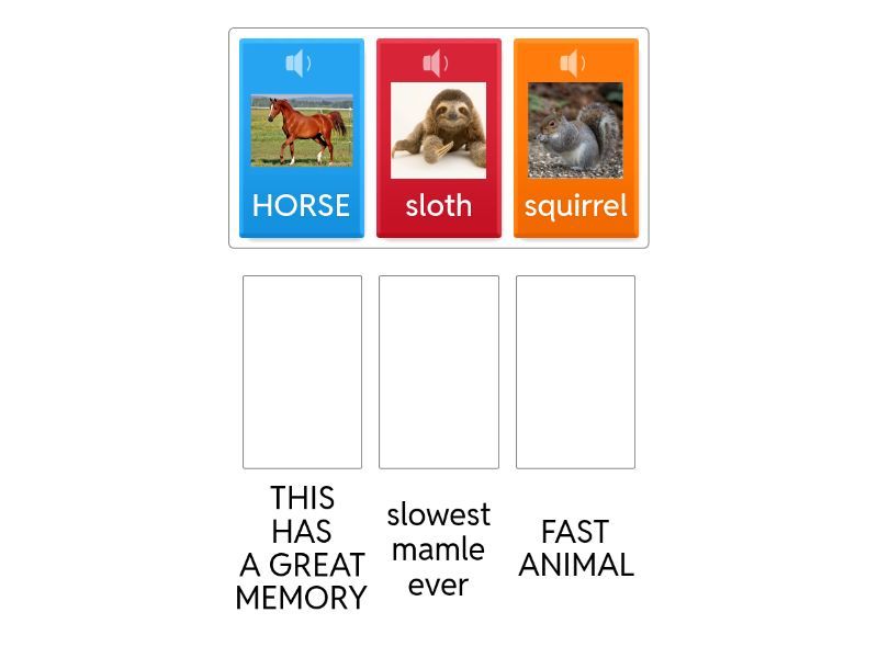 HORSE - FAST ANIMAL, squirrel - THIS HAS A GREAT MEMORY, sloth - slowest mamle ever,