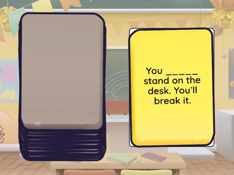 You _____ stand on the desk. You’ll break it., In our country children _____ go to school on Saturdays., People ______ feed homeless animals., You ______ read books in the darkness. It can spoil your eyesight., We had free tickets to the concert, so we ________ pay., She _________ get up so early. She gets up early because she likes to., Jack has a beard so he ________ shave every morning., I don’t want anyone to know my secret. You _______ tell about it., I’m sorry, I couldn’t come yesterday. I ______ work late., Sarah ________ do so much exercise, she is always exhausted., I _____ improve my pronunciation. Native speakers don’t understand me., If you have a toothache, you _______ take painkillers., In our family parents _______ shout at their children., You ________ go for a trip on the London Eye. The view is really magnificent. , You ________ always carry an umbrella. British weather is very changeable and unpredictable., You ________ wear a seatbelt when you are behind the wheel., My mother is a nurse and she often _______ work at weekends., In the future everyone will _______ speak English., I _______ stay in bed yesterday as I didn’t feel very well., You _________ park here. It’s “no parking” area..